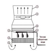 Оборотная вода через распределительную систему попадает в сопла градирни, а потом разбрызгивается по поверхности оросителя. Воздух, попадающий в градирню через входные окна, поднимаясь вверх, охлаждает воду. Затем воздух через диффузор уходит в атмосферу. Охлажденная вода стекает в резервуар градирни.